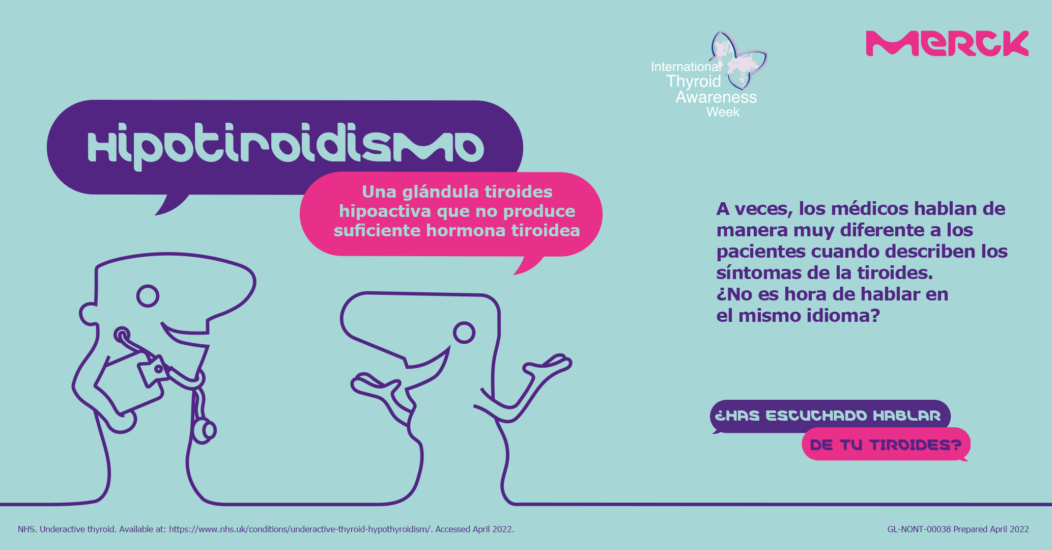 Bajo el lema ‘Hablemos de Tiroides’ Merck, compañía líder en ciencia y tecnología, en alianza con la Federación Internacional de la Tiroides (TFI), dedican la Semana Internacional de Concientización sobre Tiroides (del 23 al 29 de mayo), al abordaje de los problemas asociados a esta glándula con el firme objetivo de hacer conciencia sobre la importancia de la apertura y confianza con el médico para el diagnóstico oportuno y un tratamiento adecuado para las afecciones de la tiroides.